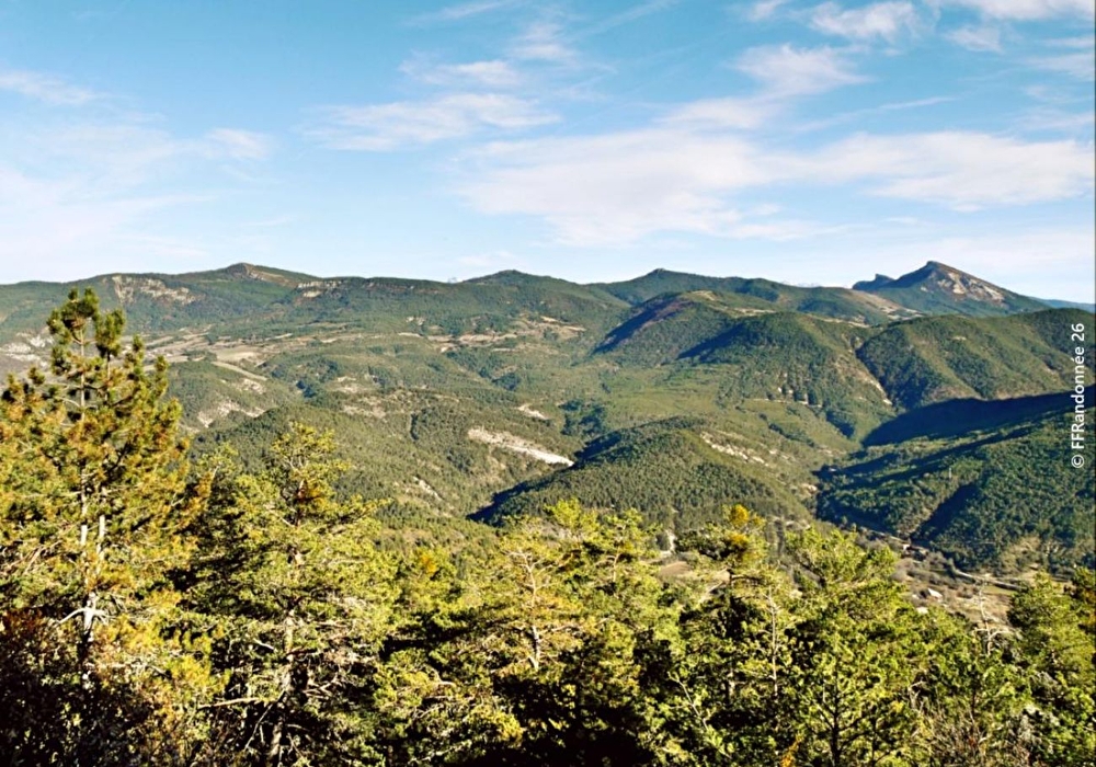 Dompel je onder in het wilde eikenbos van het land van de zwarte mergel, hier bekend als "roubines", en kom op de heuvelrug uit met een gevoel van vrijheid door deze oceaan van groen zover het oog reikt in de valleien van Establet, Motte-Chalancon en Rottier.