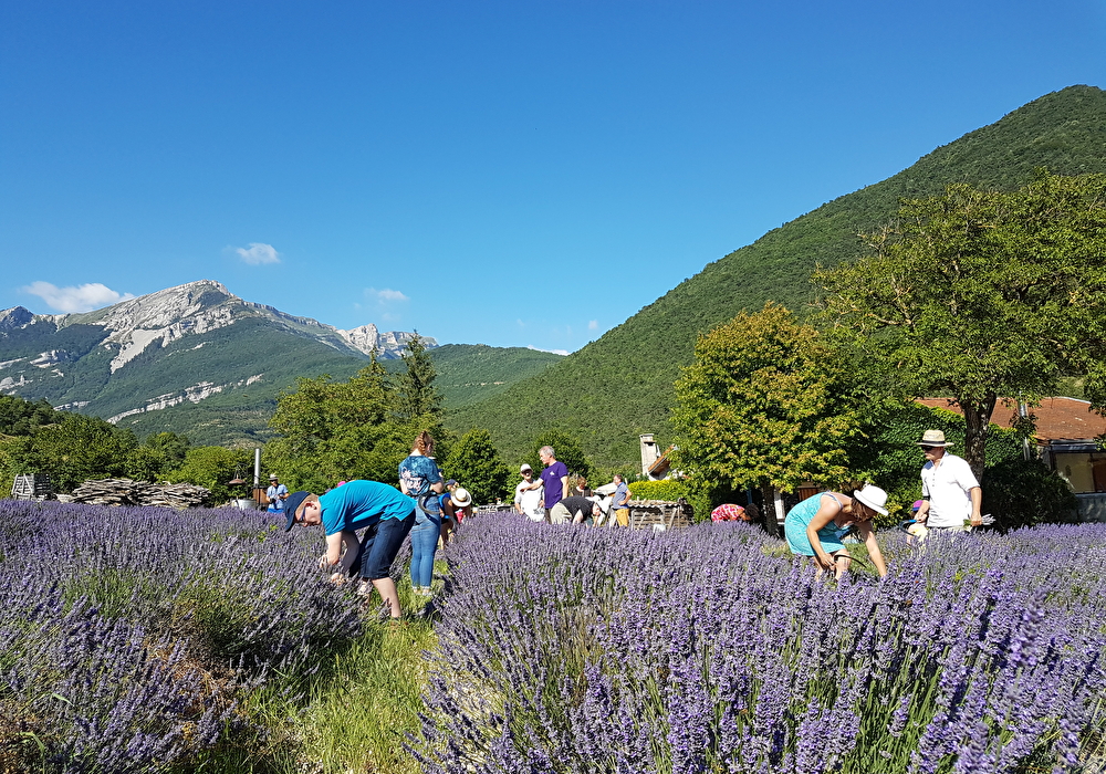 Après une présentation de notre travail et des explications sur le fonctionnement de l’alambic, direction les champs, faucille en main, pour la 1ère étape : couper les fleurs de lavande. Une fois mises en ballots, retour à la distillerie où l’alambic préchauffé vous attend pour vous livrer un peu plus tard sa précieuse huile essentielle. Visite des locaux au milieu d’anciens alambics restaurés par André, puis séance olfactive pour différencier le lavandin de la lavande. Il ne reste plus qu’à faire un petit détour par la fontaine magnifiquement fleurie pour goûter notre sirop de lavande artisanal à l’eau de source des montagnes du Vercors… Et chacun repart avec son petit flacon d’huile essentielle !