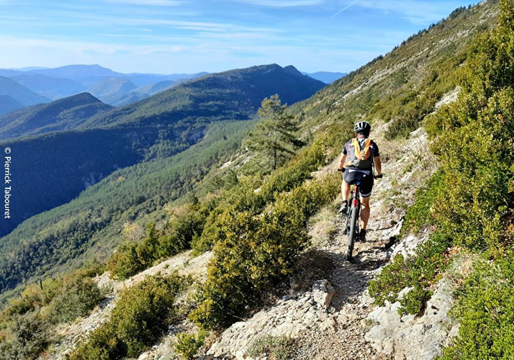 Parcours varié et surprenant au pays de la lavande avec la vue sur tout le bassin amont de la rivière Drôme, le panorama du sommet de Banne et la descente de Pracheton aux abords des champs de fleurs bleues.