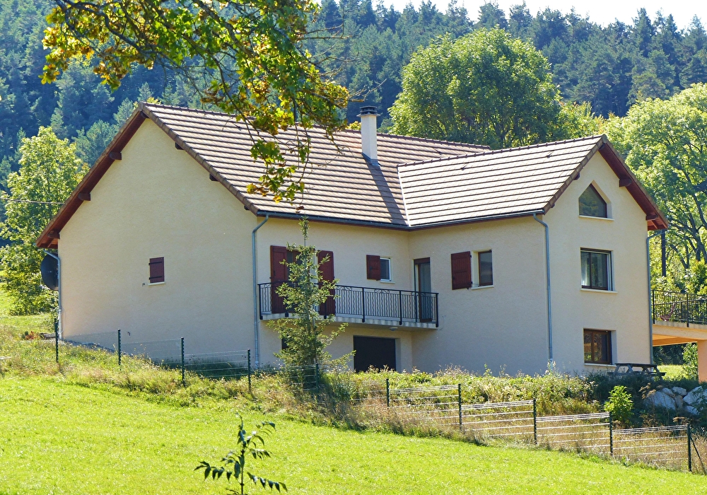 Grande maison lumineuse et moderne qui s'ouvre à 360° sur un paysage de montagne avec un jardin fermé et terrasse ensoleillée au milieu des champs à 500m du village. Cuisine très bien équipée, salles de bain privées pour chaque chambre.