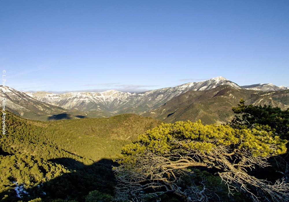 Un sentier discret chemine à travers les marnes et les pins jusqu’à la crête sauvage à cheval entre les vallées de la Gervanne et de Quint, avec pour compagnie la frange du plateau du Vercors et la traversée de villages de pierre qui se dorent au soleil.