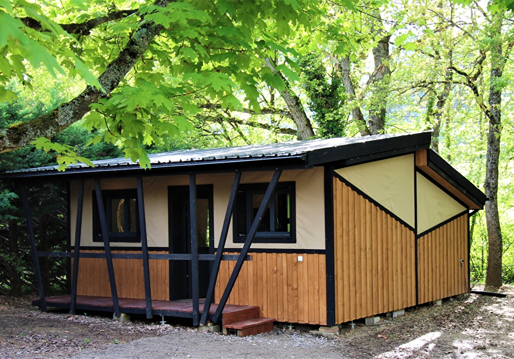 Onze "Lodge Eclipse" is een kwaliteitshuis, 100% handgemaakt en eco-ontworpen, met edele, lokale materialen. Hij staat op een schaduwrijke plaats op de gemeentelijke camping Les Écureuils in Recoubeau-Jansac.